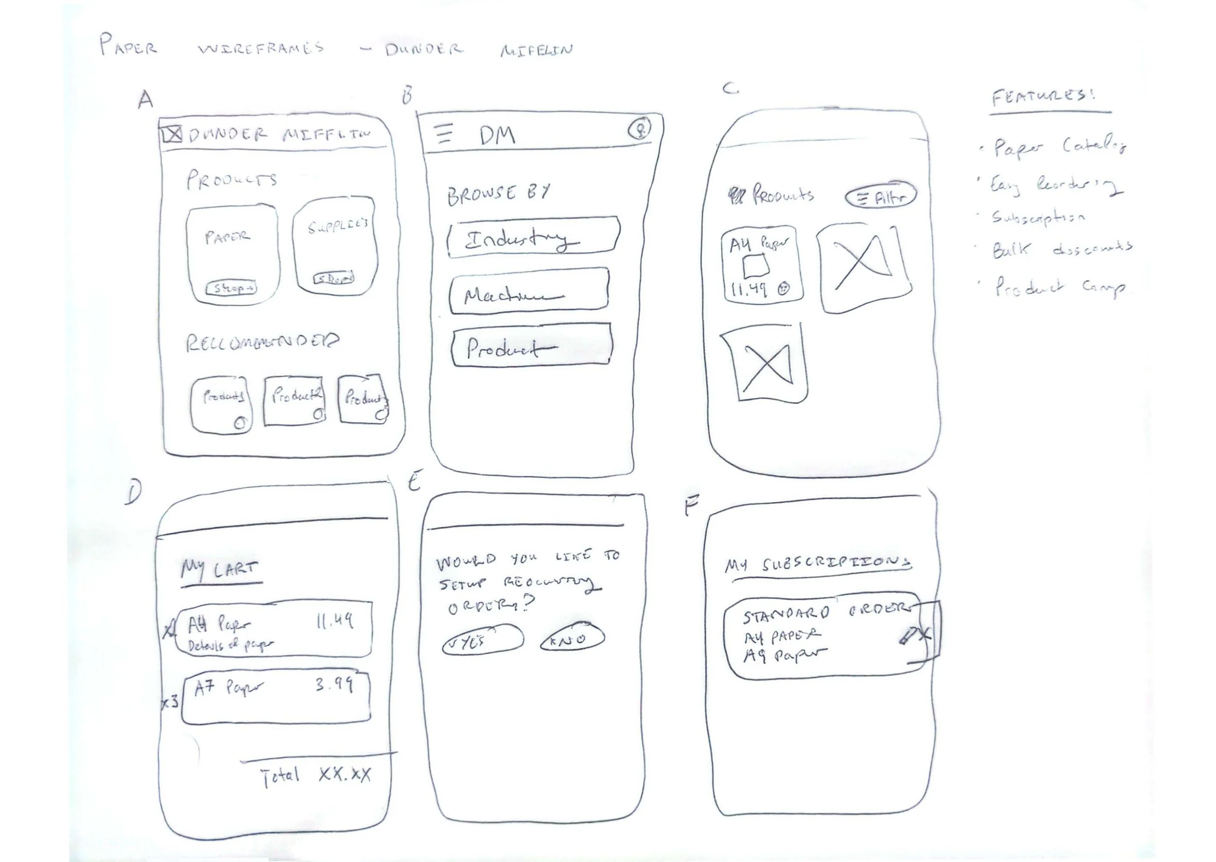 After completing the research phase, I translated key insights into paper sketches to establish the structure and flow of the new Dunder Mifflin app. For this stage, I prioritized getting ideas on to paper and identifying the initial concepts of the app.