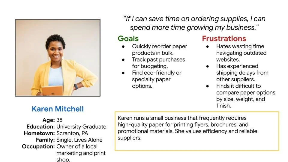 Goal: The goal of this project was to create a case study for the Google UX Design Certificate Course by imagining Dunder Mifflin’s digital presence by designing a modern e-commerce experience that transforms the traditional paper company into a customer-centric brand. The case study focuses on improving product discoverability, streamlining the ordering process, and reinforcing Dunder Mifflin’s identity as a trusted, approachable supplier for businesses of all sizes.