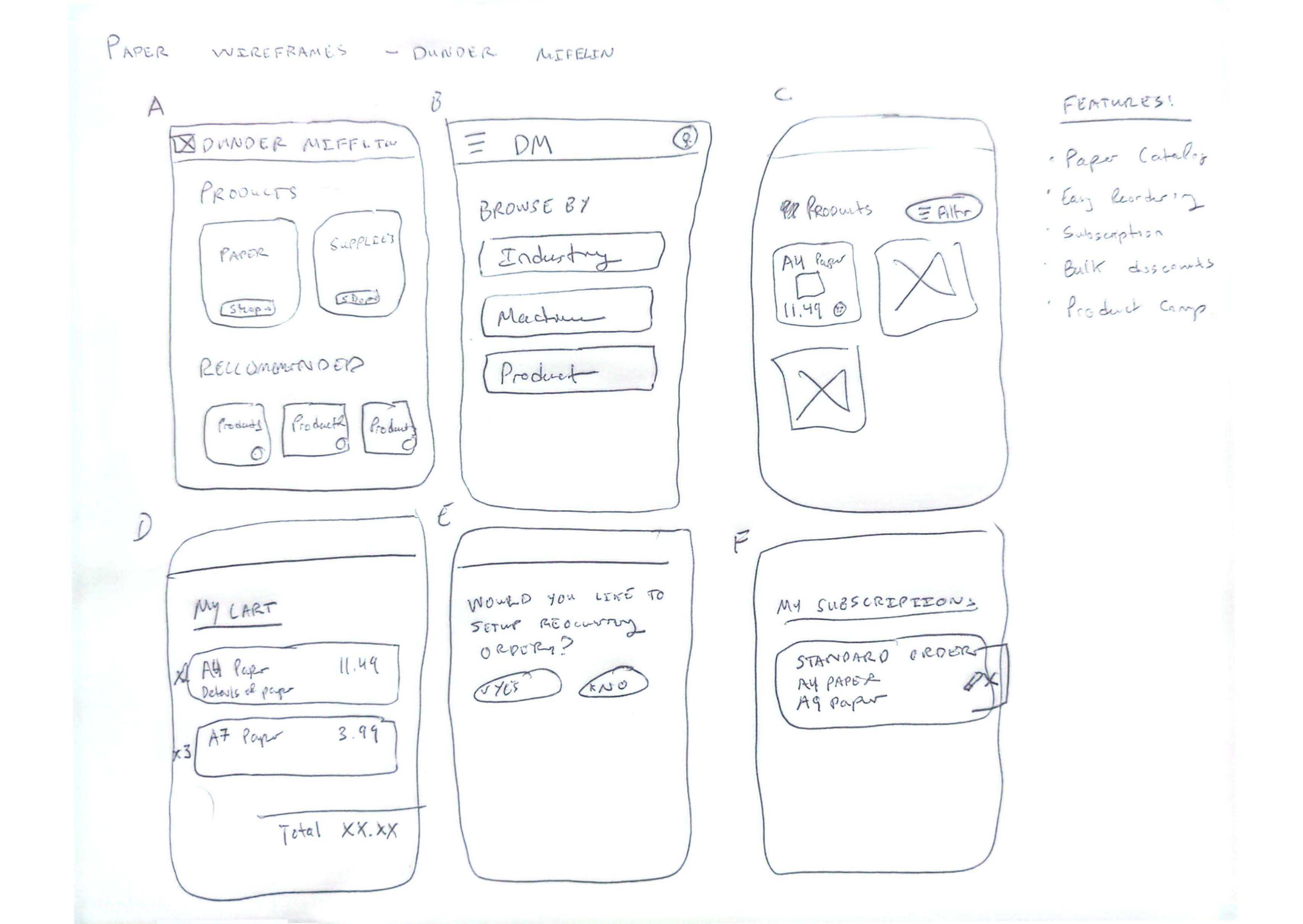 After completing the research phase, I translated key insights into paper sketches to establish the structure and flow of the new Dunder Mifflin app. For this stage, I prioritized getting ideas on to paper and identifying the initial concepts of the app along with a initial feature set.
