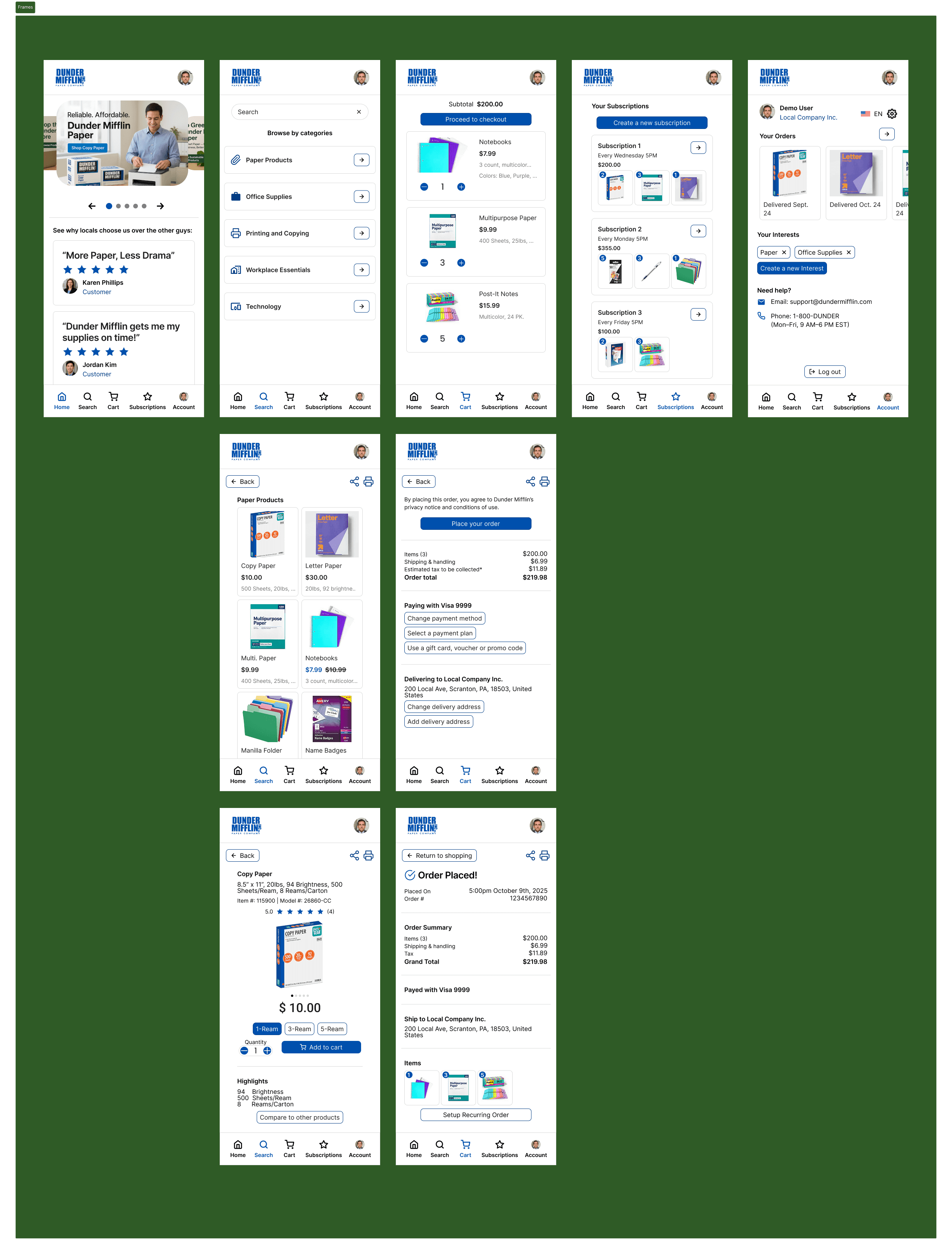 To inform the design, I conducted a usability study on some of the mockups I created for Dunder Mifflin’s app to understand how users interacted with the experience and where they encountered friction. Participants included a few local office managers who went through the process of ordering supplies for their companies - part of a potential customer base.