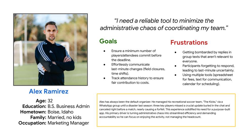 Brainstormed pain points from personal experience with casual sports meetups.